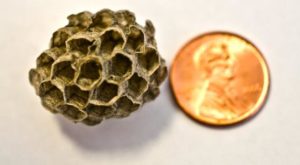 Paper wasp nest with a penny for scale